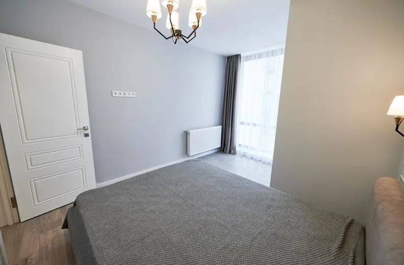 - Textiles: Se instalaron cortinas dobles con un visillo blanco translúcido para tamizar la luz y una cortina de tela más gruesa en tono gris oscuro para mayor privacidad, colgadas de un riel oculto en el techo. La cama se vistió con una colcha de piqué de algodón en gris medio y un cabecero tapizado en tela beige claro.